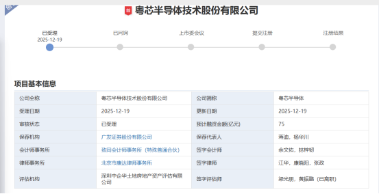12月19日,粤芯半导体技术股份有限公司(简称“粤芯半导体”)的创业板IPO申请正式获深交所受理,本次粤芯半导体拟募集资金75亿元,保荐机构为广发证券。